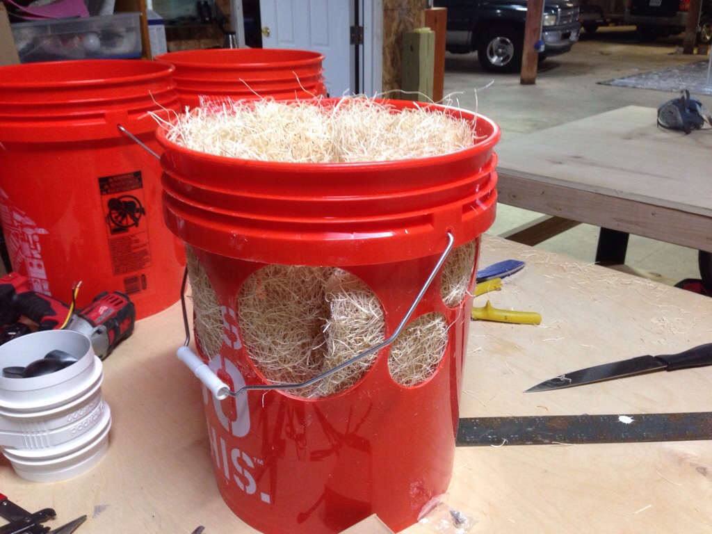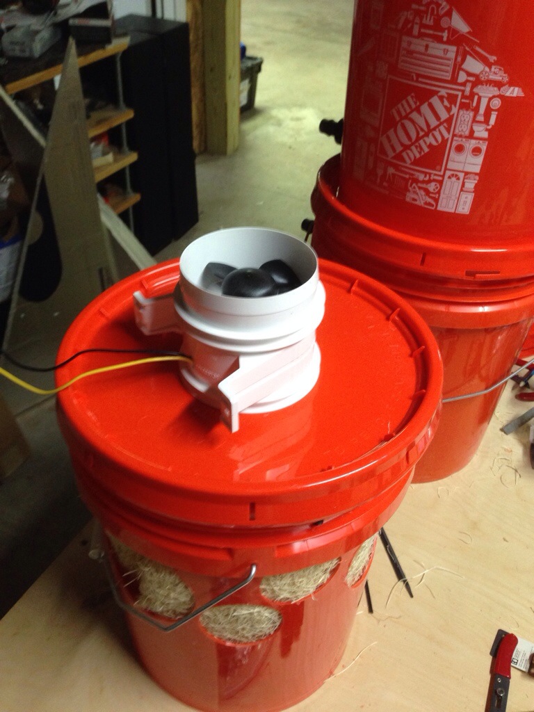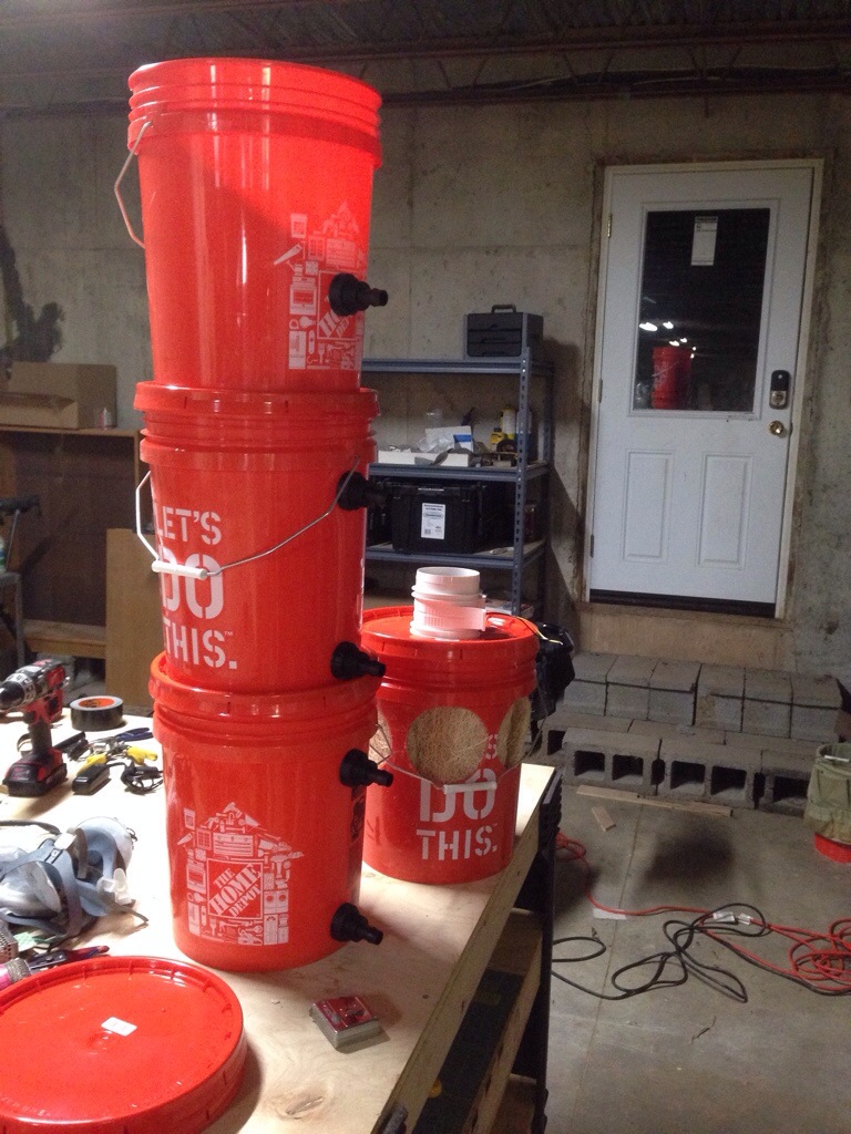 Bucket cascade for treating gray water; the top is for flocculation and settlement, then a valve will allow flow to the bottom two, which will be sand filters and chemical sanitation: