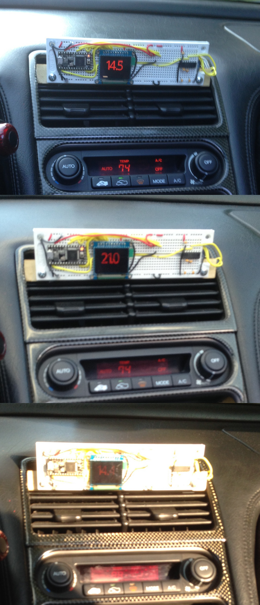 The weather was nice today so I had the top off and took a few pictures under various lighting conditions to show how it looks compared to the A/C-control display. Under all lighting conditions it’s at least as bright. I’m thinking for my final display, I will use two of these OLED screens or two slightly larger screens (1.7″ instead of 1.3″), maybe in combination with an LED-segment display. Still considering options.