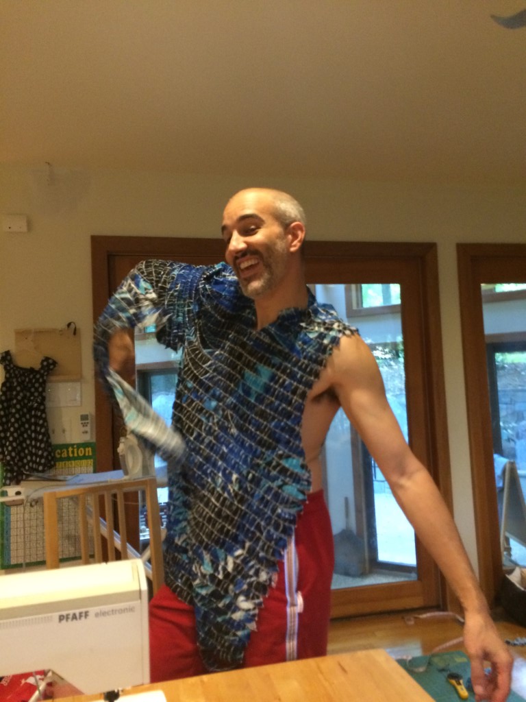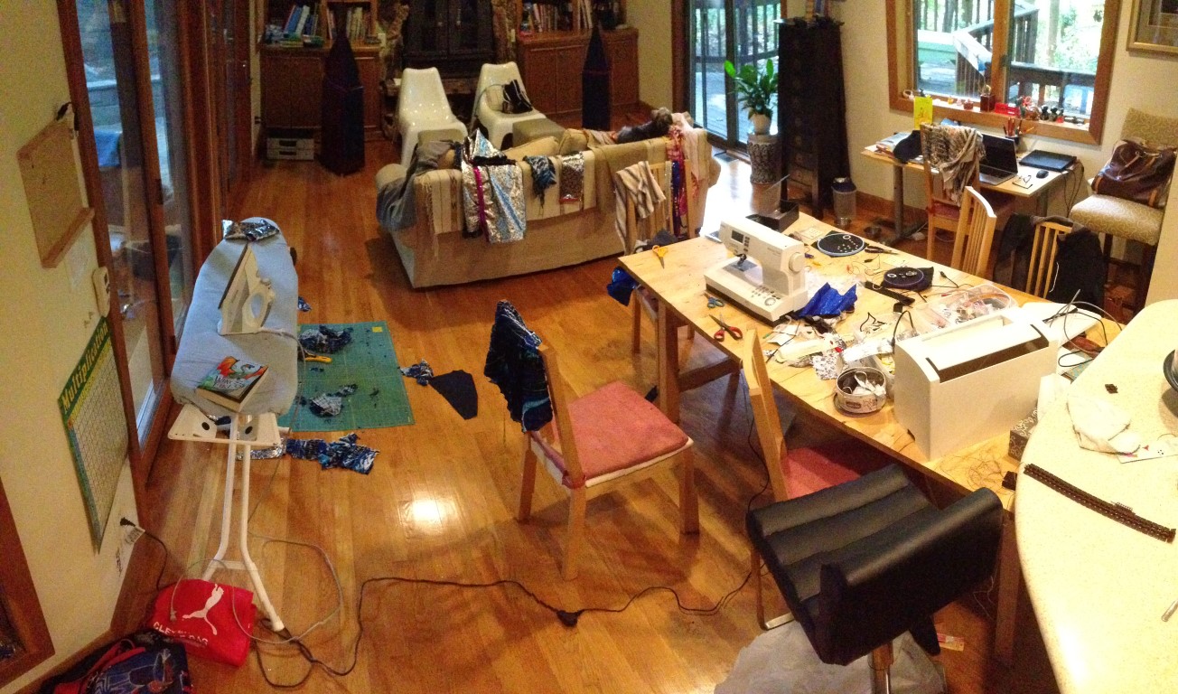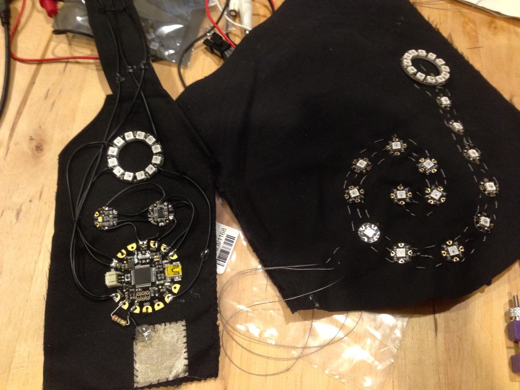 Thuy made a couple things too but no pictures. We spent much of the weekend working on lighting for the outfits. I didn’t take any picture/video of mine but here is a picture of the pieces of Thuy’s, which shows the controller, touch-sensitive pad, accelerometer, color sensor, and one ring of LEDs on the left, which will go on the front, and a pattern of LEDs (aka the Snail) that will be the back: